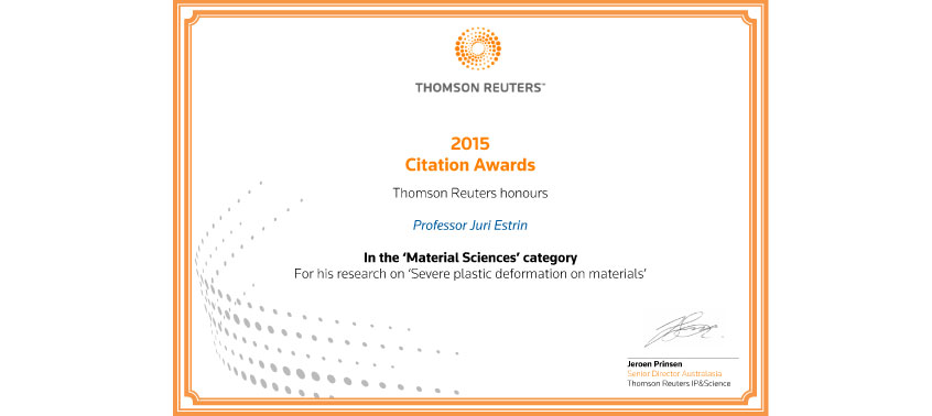 Professor Estrin is the author of about 440 papers in referred journals and conference proceedings and 10 patents. His Hirsch citation index is h = 47 for the Web of Science, and is 45 in Scopus. His name is included in the list of the most cited authors in the field of Materials Science (ISI Thomson’s Highly Cited list).