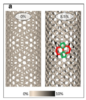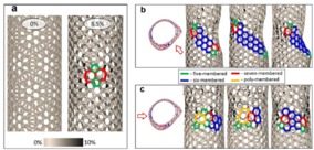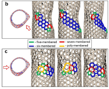 Scientists from the NUST MISIS Laboratory of Inorganic Nanomaterials have conducted simulations of the experiment at the atomic level. At first, the nanotubes were lengthened to form the first structural defect consisting of two pentagons and two heptagons (a Stone-Wales defect, pic.2a), where the prolonged lengthening of the tube began to “spread” to the sides, rearranging other carbon bonds (pic.2b). It was at this stage that the structure of the nanotubes changed. With further stretching, more and more Stone-Wales defects began to form, eventually leading to a change in the nanotubes’ conductivity (Pic. 2).