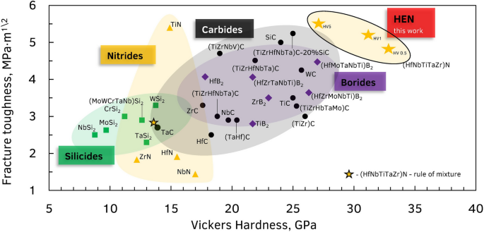 Fig. 1. Diagram of dependence of crack resistance and hardness with measured values for high-entropy nitride and previously obtained ceramics.