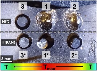 Ultra-high-temperature ceramics HfCN with the highest theoretical melting point among all currently known compounds were obtained. The melting points of the synthesized compound and the initial “record holder” — hafnium carbide were compared. To do so, pressed HfC and HfCN samples were placed on a graphite plate in the form of a dumbbell and covered with a similar plate on top to avoid heat losses. The resulting “sandwich” was connected to a powerful battery using molybdenum electrodes. All tests were carried out in high vacuum. Since the cross-section of the graphite plates varied, the maximum temperature was reached in its narrowest part. The results of simultaneous heating of the new material, carbonitride and hafnium carbide, showed that carbonitride has a higher melting point than hafnium carbide (Fig. 2).